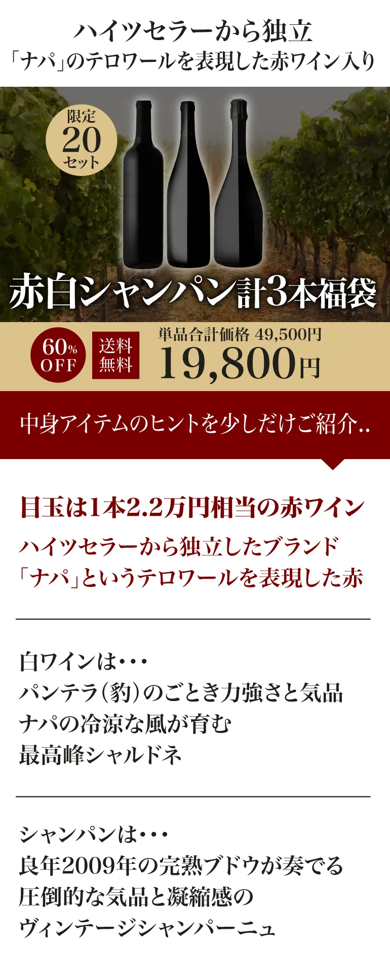 ハイツセラーから独立したブランド「ナパ」というテロワールを表現した赤ワイン入り 赤白泡ミックス計3本福袋