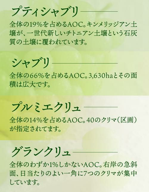 格付はプティ・シャブリ、シャブリ、シャブリ・プルミエ・クリュ、シャブリ・グラン・クリュの4つに分類され、クラスが上がるほど香りと複雑味が増し、熟成のポテンシャルも高まります。