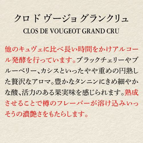 ヴージョのワインは、凝縮した果実味、しっかりとした骨格、長い余韻が特徴で、若いうちは力強く、熟成によって複雑さと深みが増していきます。特にクロ・ド・ヴージョは生産者ごとの差異も楽しめ、テロワールと造り手の哲学が表情豊かに現れます。肉料理や味わいの濃い料理との相性も良く、特別な食卓にふさわしい存在感を放ちます。