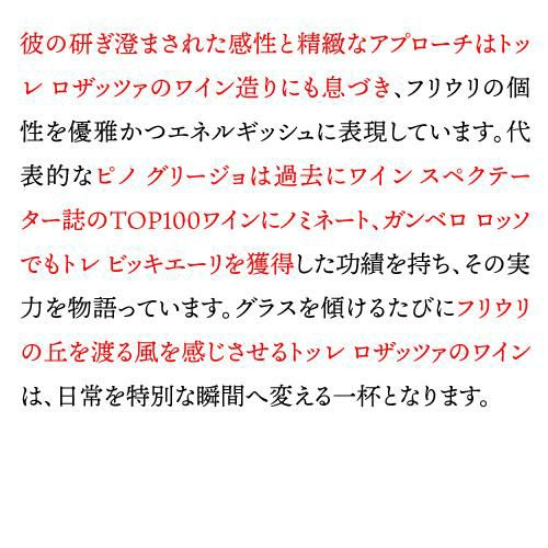 他の画像を見る 宅配便(冷蔵可) 小岩(グラーヴェ)の土壌で育つブドウを使用したフリウリ ピノ グリージョ フリウリ グラーヴェ [2023] トッレ ロザッツァ 750mlワイン 白ワイン ¥ 2,970 税込 お気に入りに登録する