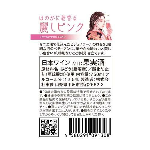 他の画像を見る 宅配便(冷蔵可) 麗しシリーズに新作登場 ほのかに苺香る 麗しピンクロゼ スパークリングワイン 12.5度 750ml ビジュノワール国産 日本ワイン 東夢ワイナリー Uruwashi pink ¥ 5,940 税込 お気に入りに登録する