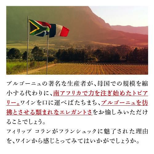 他の画像を見る 宅配便(冷蔵可) ブルゴーニュの著名生産者フィリップ・コランが手掛ける赤 トピアリー バイ フィリップ コラン カベルネ ソーヴィニヨン [2020] 750ml南アフリカ 西ケープ 赤ワイン ¥ 3,300 税込 お気に入りに登録する
