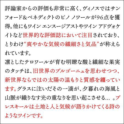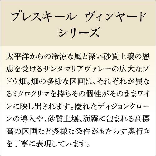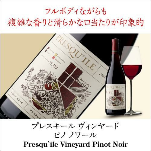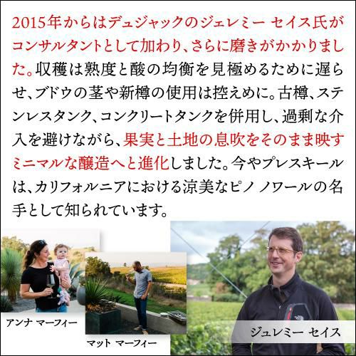 他の画像を見る 宅配便(冷蔵可) フルボディながらも複雑な香りと滑らかな口当たりが印象的 プレスキール ヴィンヤード ピノ ノワール [2023] プレスキール 750ml アメリカ サンタ バーバラ赤ワイン ¥ 12,100 税込 お気に入りに登録する