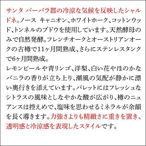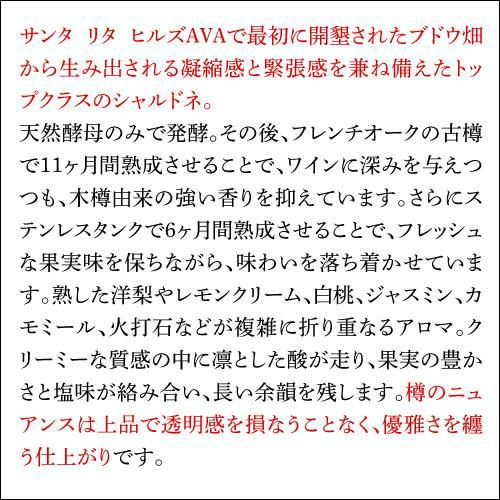 他の画像を見る 宅配便(冷蔵可) 自社畑の2つの若いブドウの木で収穫したものをブレンド シャルドネ サンタ リタ ヒルズ [2022] サンフォード 750mlアメリカ カリフォルニア 白ワイン ¥ 8,800 税込 お気に入りに登録する