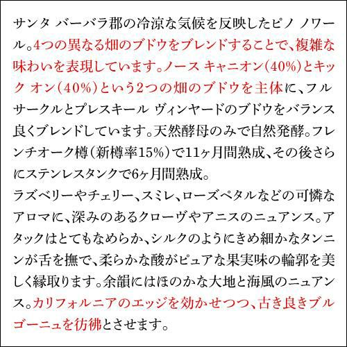 他の画像を見る 宅配便(冷蔵可) 土壌をダイレクトに感じられるパワフルな凝縮感 サンタ バーバラ カウンティ ピノ ノワール [2023] プレスキール 750ml アメリカ サンタ バーバラ赤ワイン ¥ 5,500 税込 お気に入りに登録する