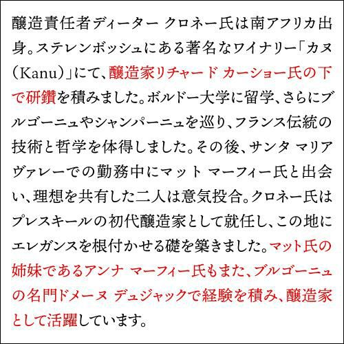 他の画像を見る 宅配便(冷蔵可) 柔らかな果実香と凛としたミネラル感を味わう プレスキール ヴィンヤード シャルドネ [2023] プレスキール 750ml アメリカ サンタ バーバラ白ワイン ¥ 9,680 税込 お気に入りに登録する
