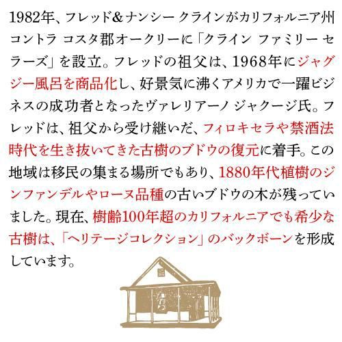 他の画像を見る 宅配便(冷蔵可) 樹齢100年超!自根の古樹ジンファンデル エンシェント ヴァインズ ジンファンデル コントラ コスタ カウンティ [2022] クライン 750mlアメリカ カリフォルニア 赤ワイン ¥ 4,950 税込 お気に入りに登録する