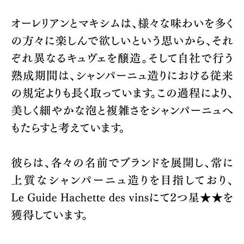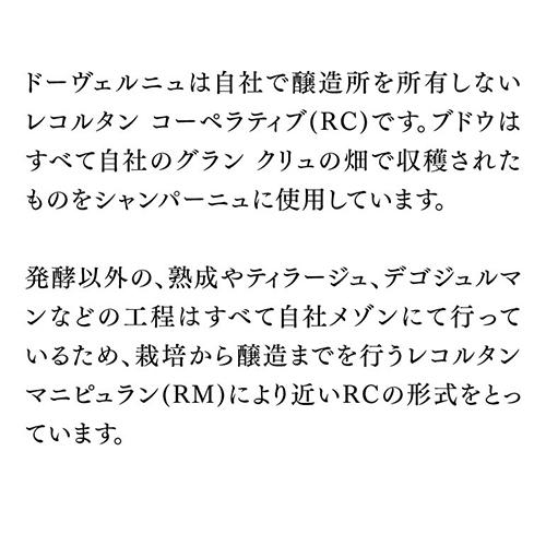 グランクリュに5.3ha所有するブドウのみを使用。醸造所を所有していない為、レコルタン・コーペラティブ(RC)となりますが、熟成、ティラージュ、デゴジュルマンなどは全て自社メゾンにて行っています。