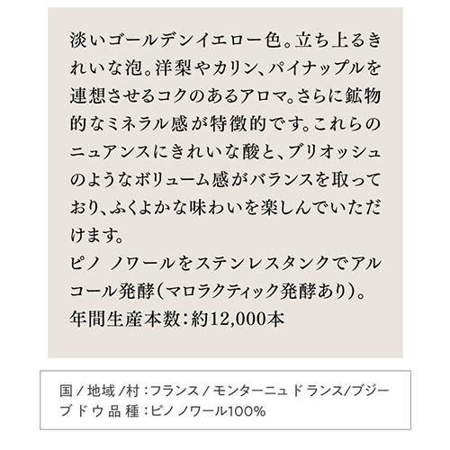 淡いゴールデンイエロー色。立ち上るきれいな泡。洋梨やカリン、パイナップルを連想させるコクのあるアロマ。さらに鉱物的なミネラル感が特徴的です。これらのニュアンスにきれいな酸と、ブリオッシュのようなボリューム感がバランスを取っており、ふくよかな味わいを楽しんでいただけます。