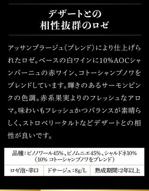 ロゼ・シャンパーニュ(Rose Champagne)は、美しいピンク色と華やかな香りが特徴のシャンパンです。赤ブドウの果皮を使用する製法により、繊細なフルーティーさと程よい酸味、複雑な味わいが楽しめます。特別な日の乾杯や贈答用にも人気の高いワインです。