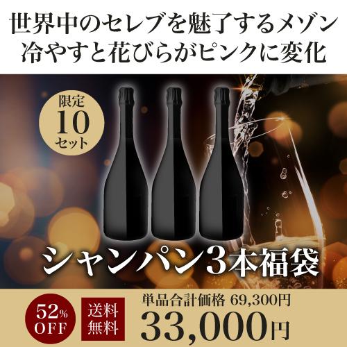 他の画像を見る 世界中のセレブを魅了するメゾン 冷やすと花びらがピンクに変化 泡3本福袋 送料無料 69,300円(税込)相当が入って33,000円(税込)! シャンパン3本 3万円(税別)福袋 2026 2026年 シャンパーニュ 福袋 ワインセット 宅配便(冷蔵可) ¥ 33,000 税込 お気に入りに登録する 販売期間 2026/04/15 18:00 〜 2026/04/19 23:59