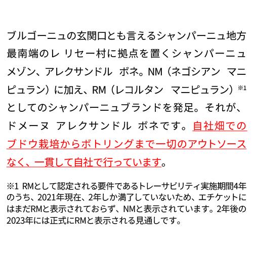 他の画像を見る サクラアワード2022ゴールド受賞レ・リセのテロワールを映すブラン・ド・ノワール ドメーヌ アレクサンドル ボネブラン ド ノワール エクストラ ブリュット 750ml BOX 箱付シャンパン シャンパーニュ 宅配便(冷蔵可) ¥ 12,100 税込 お気に入りに登録する 在庫切れ
